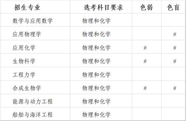 6 i" s' C# f9 e 我校招生专业包括数学与应用数学、应用物理学、应用化学、生物科学、工程力学、合成生物学、能源与动力工程、船舶与海洋工程。所有招生专业在非高考改革省份招收理科考生,在高考改革省份选考科目要求见下表: