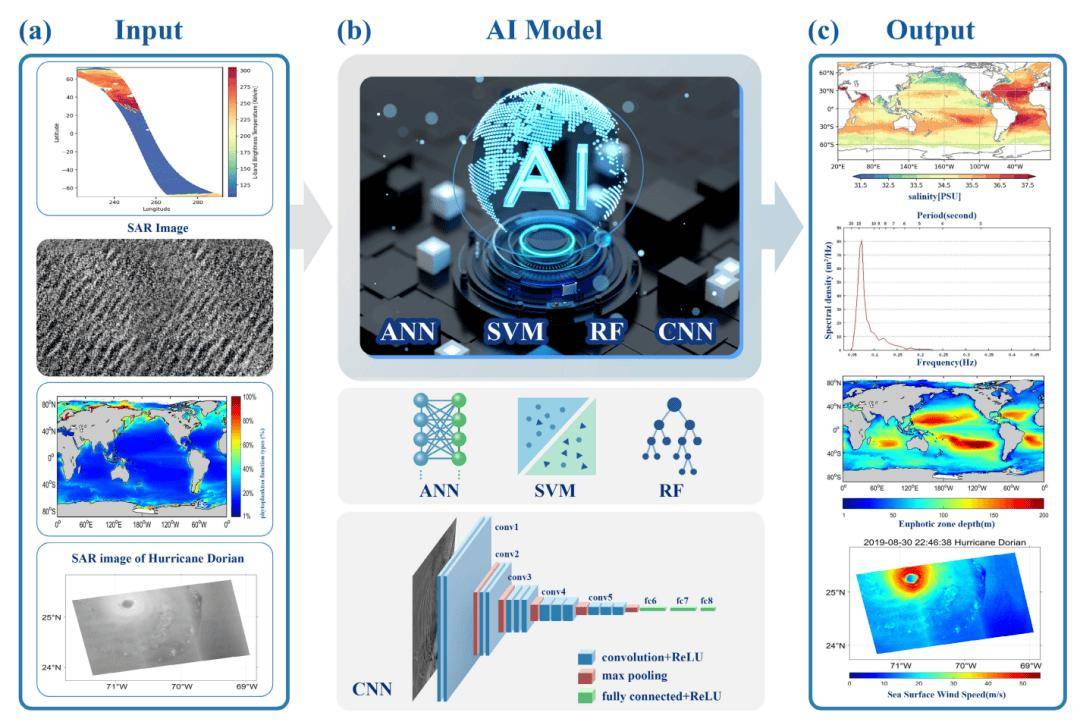 1 k, I0 d# Q- X& Q3 n* `) S (a) 多源卫星观测输入数据;(b) 主要AI模型(包括ANN和CNN);(c) 反演得到的海洋环境参数结果。