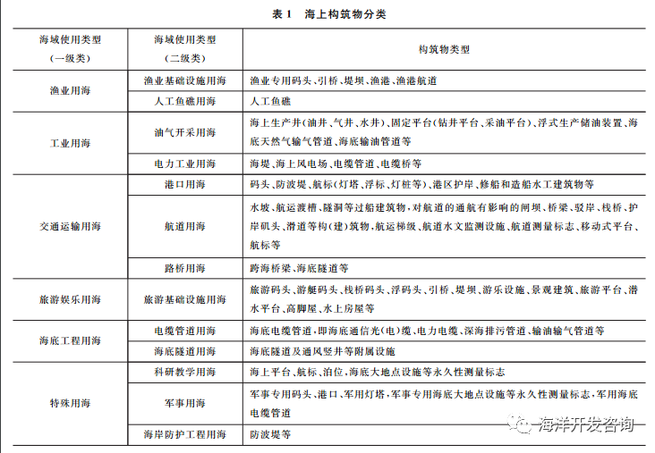 ! S& M1 ?1 S5 }2 x B9 W& P根据《深圳市海上构筑物登记暂行办法》,海上构筑物是指在本市海域内的固定建筑物和构筑物, 包括码头、海上固定平台、海底隧道、桥梁、高架屋、人工渔礁以及法律法规规定的其他海上构筑物。综合来看,海上构筑物就是搭建于海上的构筑物,包括海上固定平台、海底隧道、桥梁、高架屋、人工鱼礁、大型深水网箱、海上波浪能发电等科学实 验装置,法律法规规定的其他透水式的海上构筑物以及采用非透水方式构筑不形成有效岸线的码头、突堤、引堤、防波堤、路基、设施基座等构筑物。不同海域使用类型采用的海上构筑物有所不同。根据《海域使用分类》,对不同海域使用类型可采用的海上构筑物类型进行梳理。9 O8 l' i2 M0 @9 w; c- ]; H7 v& u