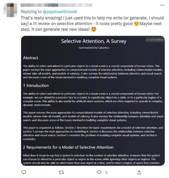 Yann LeCun 评论:这个工具( Galactica )于论文写作而言,就像辅助驾驶之于驾驶一样,它不会帮你自动写论文,但它会在你写论文的时候大大减轻你的认知负担。