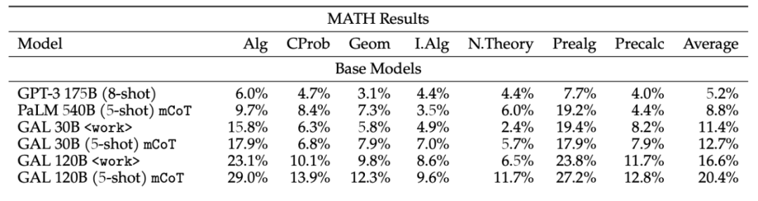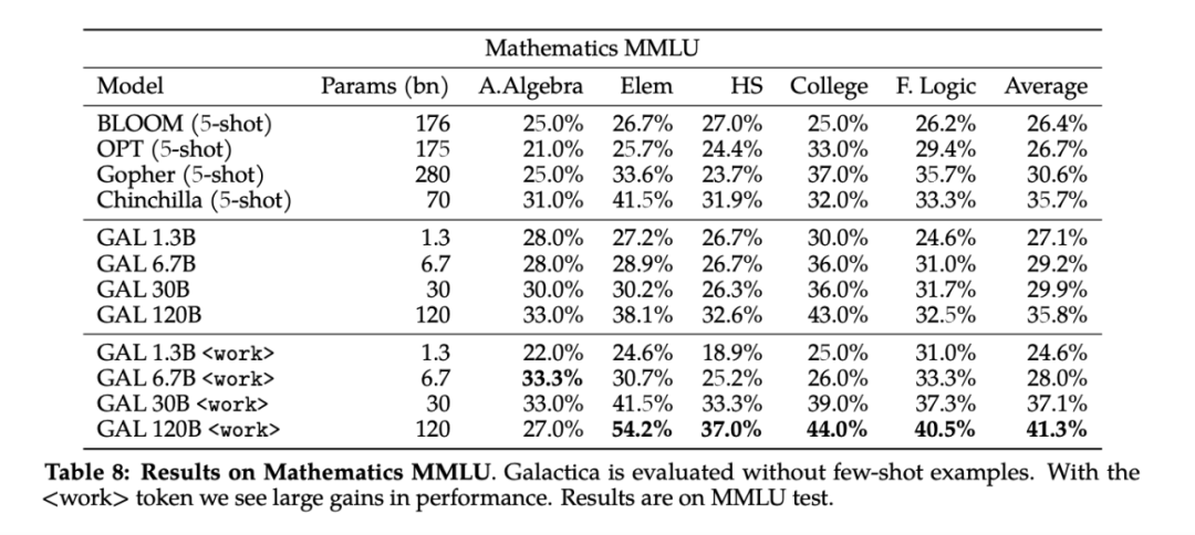 + m" ^# o5 A* s5 o 另外,Galactica 在推理方面表现十分出色,在数学 MMLU 上的表现优于 Chinchilla 41.3% 至 35.7%,在 MATH 上的 PaLM 540B 得分分别为 20.4% 和 8.8%。