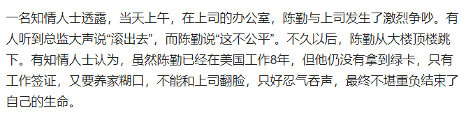 因为陈勤虽在美国待了8年,但他并没有拿到绿卡。他持有的是H-1B临时工作签证,如果被开除,他要在60天内找到新的工作,否则全家都要离开美国。 0 U5 K2 Q% C: w% z+ G' R