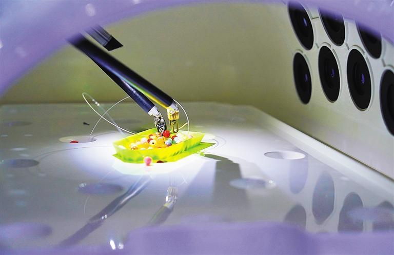 多孔腔镜手术机器人进行串珠演示。本届高交会上,“身怀绝技”的机器人纷纷亮相,让观众大饱眼福。