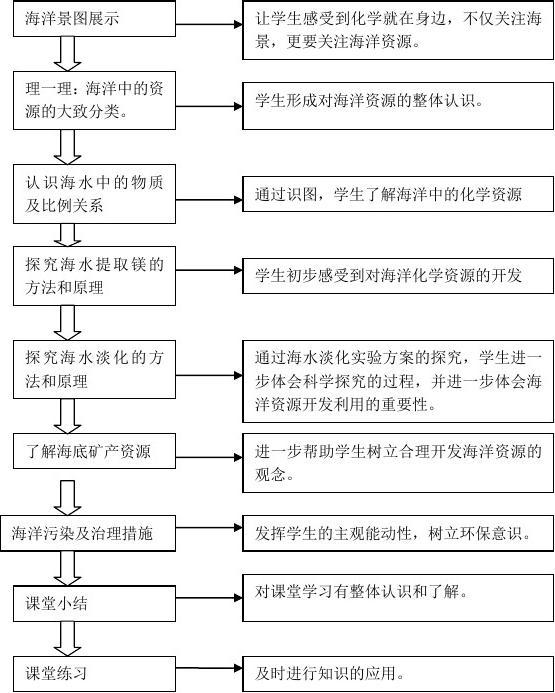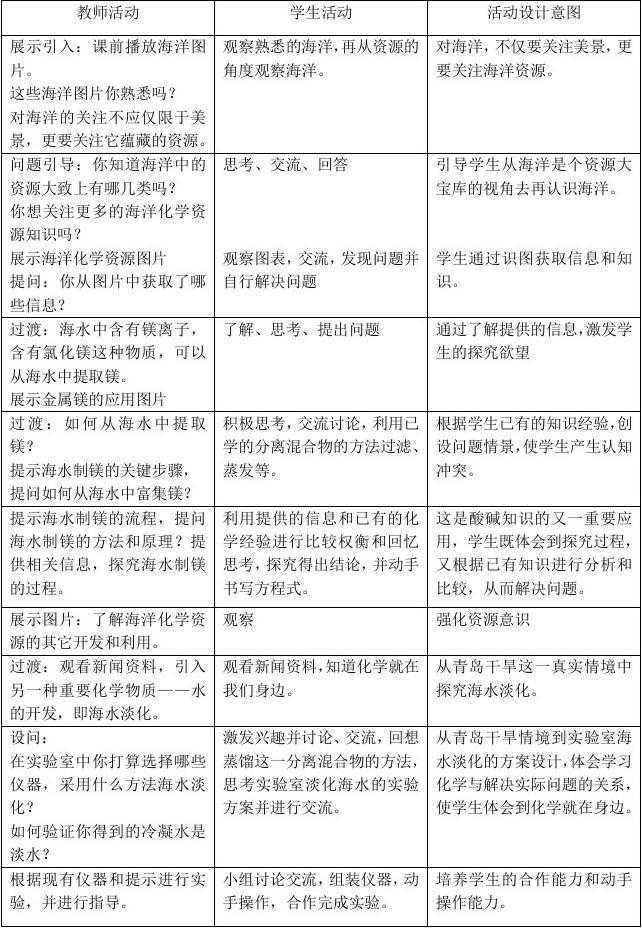 9 _! s' x! A$ l) U0 G* l【学情分析】黄岛的学生尽管在海边生长,但他们对海洋的了解,更多的是看到了大海的壮观、海边景色的优美和餐桌上丰富的海鲜,学生很可能不会从资源的角度去认识海洋,他们知道大庆油田,但很少有人知道从海洋中也可以开发石油,也不知道我们做燃烧实验使用的镁条可以从海水中提取出来,对海水淡化更是知之甚少。所以本节课先要设法让学生认识到海洋是个资源宝库,可开发海水中的物质以造福人类。