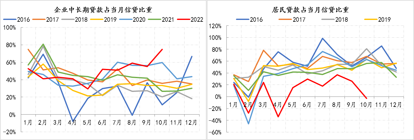 ! x' O- j. n: X+ w 从历年企业与居民各月债务融资分布情况来看,企业融资需求保持修复和居民融资需求持续低迷的情况同样也是十分明显的。截至10月末,企业中长期贷款占当月信贷比重升至历年同期最高水平的75%,而居民贷款的占比则再次跌落至零以下。 # I& F0 d/ H: m! k5 J A& s