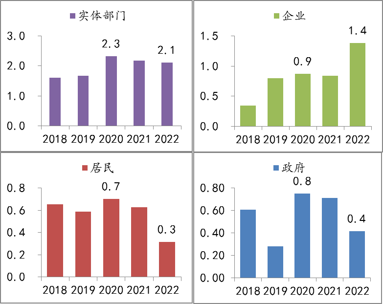 # u& H" z+ E5 [/ c! n: n 如图1显示,今年实体部门9月与10月债务融资平均规模为2.1万亿,略低于前两年的同期水平,其中主要是居民和政府债务融资的下降所致,而企业的债务融资规模则升至历史最高的1.4万亿。因此,从实体部类各部门历年两个月均值变化情况来看,企业的融资需求保持着修复态势,相应影响全社会融资需求的环节依然在居民端。