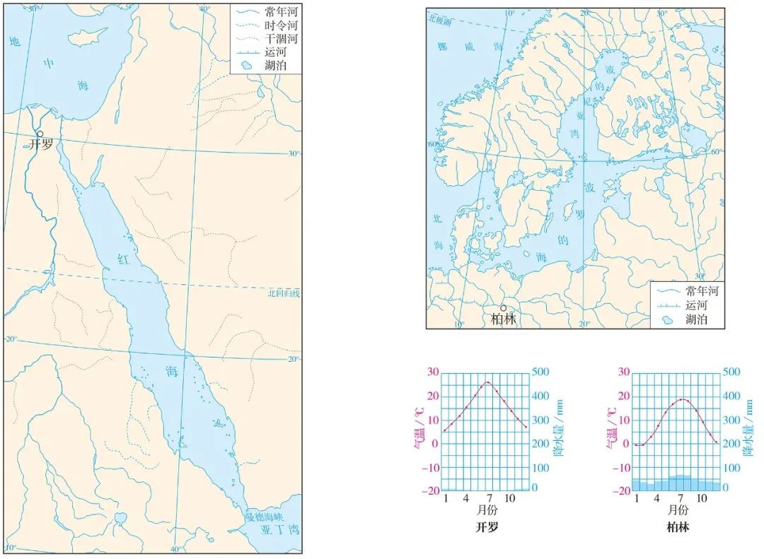 图 红海和波罗的海沿岸地区的水系及代表地多年平均各月气温和降水量 $ Y5 w# f% D1 J d# a( d. m6 B