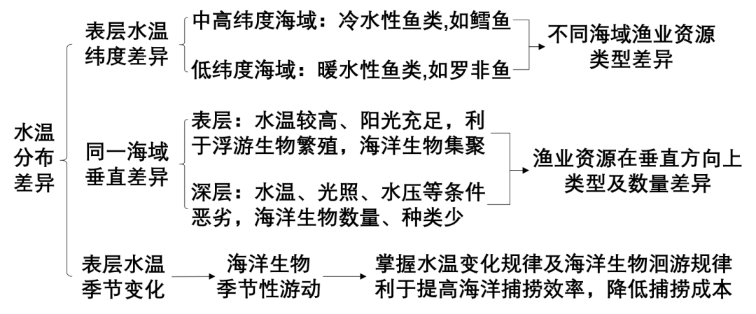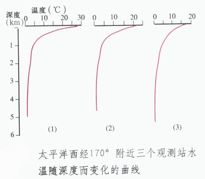 ①垂直方向上:水深1 000米以内,水温随深度增加而明显下降;水深1 000米以下,水温较低(约4℃),基本不变。 7 w5 a1 [1 @$ W( v9 h z