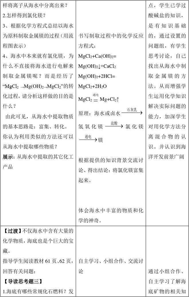 本节教材的重点是关于海水提镁和海水淡化的基本原理。对于海水提镁,重要的是要引导学生知道富集的方法在化学上的应用;关于海水的淡化,一方面让学生了解淡化的方法,另一方面要培养学生的实验探究能力,从中渗透节水意识的培养。