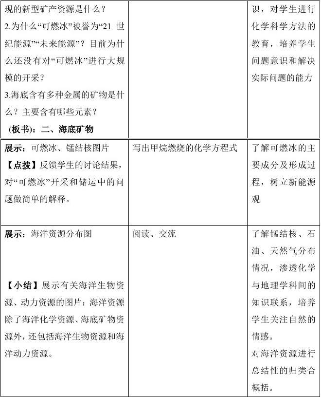 运用图示、列表等方式认识海洋中蕴藏着丰富的资源,认识合理开发海洋资源与保护海洋环境的辩证关系;通过对海水淡化的实验探究,学会蒸馏法分离物质,认识海水淡化的可行性,进一步树立资源意识。