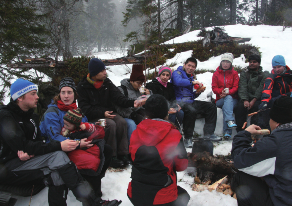 - u9 j4 h# r5 {& p" X! k: y 周利(后排右四)在挪威读博期间和同学在一起