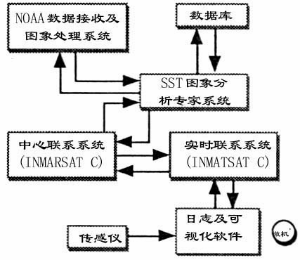 西班牙圣第亚哥大学(University of Santiago) (J.A. Trinanes et al.,1994)的系统实验室利用专家知识建立有效的数据库结构和专家系统,已初步完成了一个实用的渔业信息系统(TUNAFIS, 见图3)。该系统已被一个政府支持的项目所证实,系统预测结果与实际调查结果基本一致。该系统主要借助卫星通过交通船提供信息服务,用以获取鱼群活动信息和环境变化信息,开发和改善渔业策略,提高最终渔业的产量。通过实验证明,该系统能够较好地完成其预定的目标。