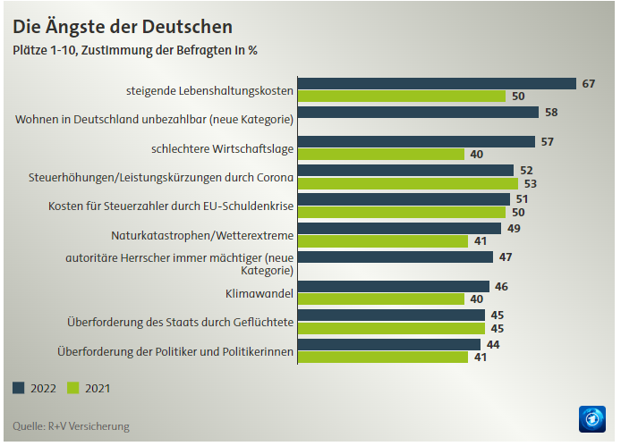 * b4 @5 i- b' W5 i4 j, e3 S 2022年的世界充满着动荡与不安。调查显示,大约三分之二的德国公民(67%)对各种社会问题感到担忧和恐惧。那么,德国人最害怕的是什么呢? * A- Z4 d0 J0 c B: ^