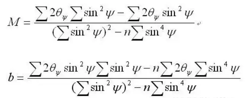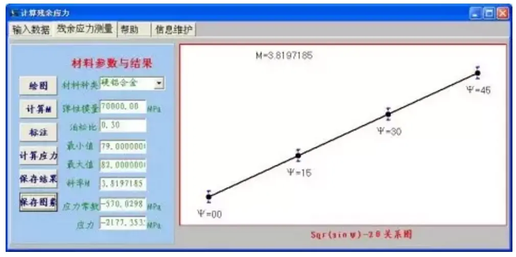 最后,作2θ-sin2ψ的关系直线,最后按应力表达σ=K·Δ2θ/Δsin2ψ= K·M求出应力值。