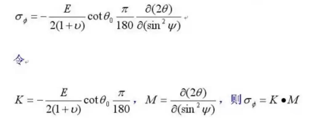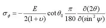 其基本原理是:当试样中存在残余应力时,晶面间距将发生变化,发生布拉格衍射时,产生的衍射峰也将随之移动,而且移动距离的大小与应力大小相关。用波长λ的X射线,先后数次以不同的入射角照射到试样上,测出相应的衍射角2θ,求出2θ对sin2ψ的斜率M,便可算出应力σψ。