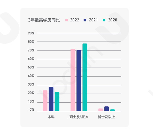& Z7 N+ @% L: v 根据Lockin 平台注册用户的信息统计,2022届毕业的海归中,硕士及MBA学历占比最多,超过70%,本科达到24.93%。经过进一步调查,发现硕博学历的2022应届海归中,本科就读于国内双一流大学的占比接近30%,本科在国外大学就读的比例为35%,近年来在国外从本科开始留学的人数有所上升。 * o* A" V ]! |. p7 x