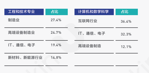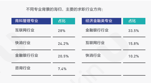 [8 y% {* z& D% m, ]3 i) ^ 在海外人才首次求职过程中,会受到专业背景的直接影响,超过73%的候选人会选择与本专业相关的行业。下面几个专业背景的海归求职数据显示,互联网是大多数人的选择,金融专业被选择的比例也很高;计算机专业、工程技术专业的毕业生,对未来职业方向的定位更为精准,基本集中在互联网、制造、通信等领域。