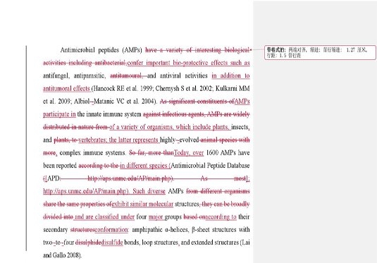 润色采用双轮编辑审校,除了逐字逐句地检查语言语法,审查句子的逻辑性,还有“审稿人”视角的专业审核和详细指导建议。我们在论文写作过程中避免不了的使用中文思维,例如“Antimicrobial peptides (AMPs) have a variety of interesting biologieal activities including antibacterial, antifungal, antiparasitic, and antiviral activities.”是我们很多人写论文的常用句型,这句话对结果的展示非常笼统,经过润色编辑的修改后“Antimicrobial peptides (AMPs) ,confer important bio-protective effects such as antifungal, antiparasitic, and antiviral activities in addition to antitumoral effects.”句式不仅变得更有趣了,因果关系也更清晰。专业的润色除了帮你在发刊路上事半功倍,也对之后的论文写作有很大的借鉴意义。每次润色完后,作者甚至还可以总结一下这种语言逻辑问题,下次写论文加以避免。