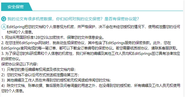在论文发表前作者最在乎论文的保密性,这也是我选择艾德思的原因,艾德思EditSprings做到了100%的信息安全保密,与他们合作让我很安心。官方网站采用国际标准128位SSL加密技术,并且作者的每一笔订单都会自动生成相对应的保密协议,协议书加盖艾德思企业公章,若作者文稿内容被泄露,作者可根据实际情况追究其法律责任。 . Y1 C: u; o7 l