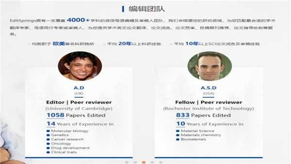 艾德思EditSprings汇集4000多位学科教授级编辑专家,涵盖18个大学科领域,可以快速匹配到领域内最合适的润色编辑,大大节省时间。而且这些润色编辑不仅语言方面知识储备丰富,也有专业的学术素养和丰富的论文发表经验。