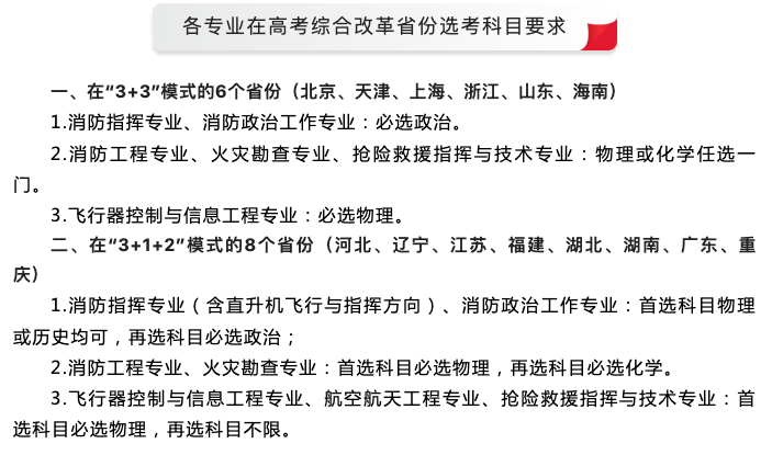 上游新闻注意到,在对各招生省份的选考科目要求上,物理成为最“硬核”专业:如考生首选科目是物理,可填报8个专业。此外,化学和政治也是中国消防学院比较看重的科目。有意思的是,消防指挥专业(含直升机飞行与指挥方向),对首选科目的要求还可以是历史。 2 b/ d4 A! n+ v" T; J, |0 O