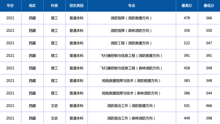 上游新闻统计发现,中国消防救援学院2021年录取分数中,全国最高录取分数为660分,专业为消防工程(消防救援方向),录取地为重庆;全国最低录取分数为344分,专业为抢险救援指挥与技术(森林消防方向),录取地为西藏。