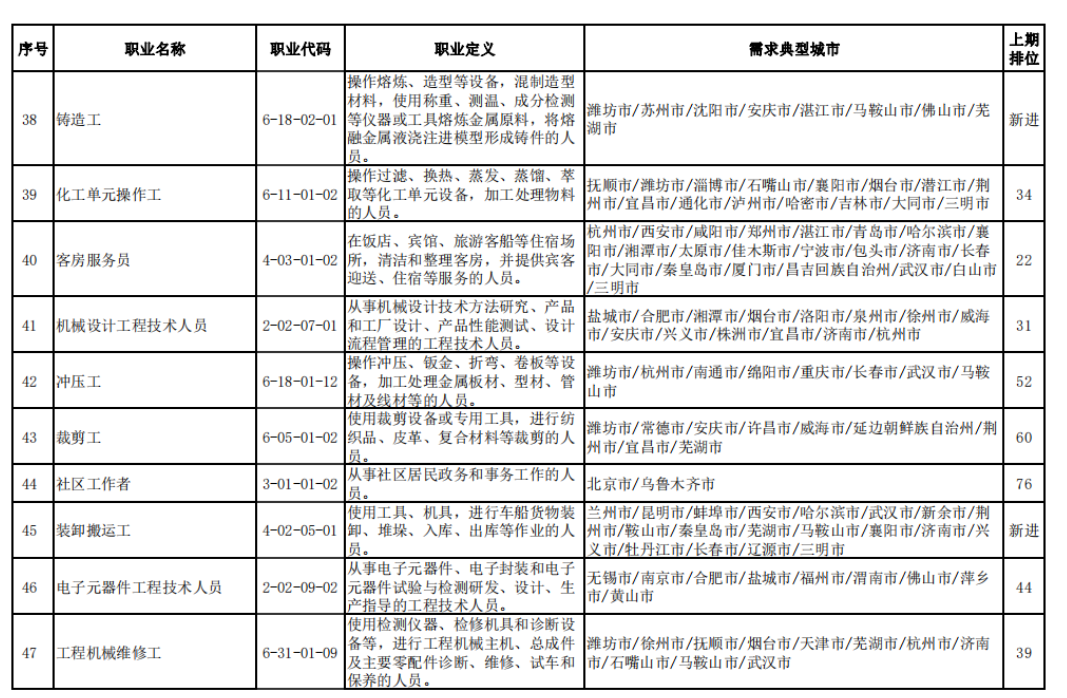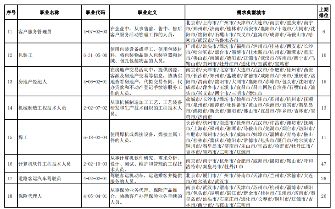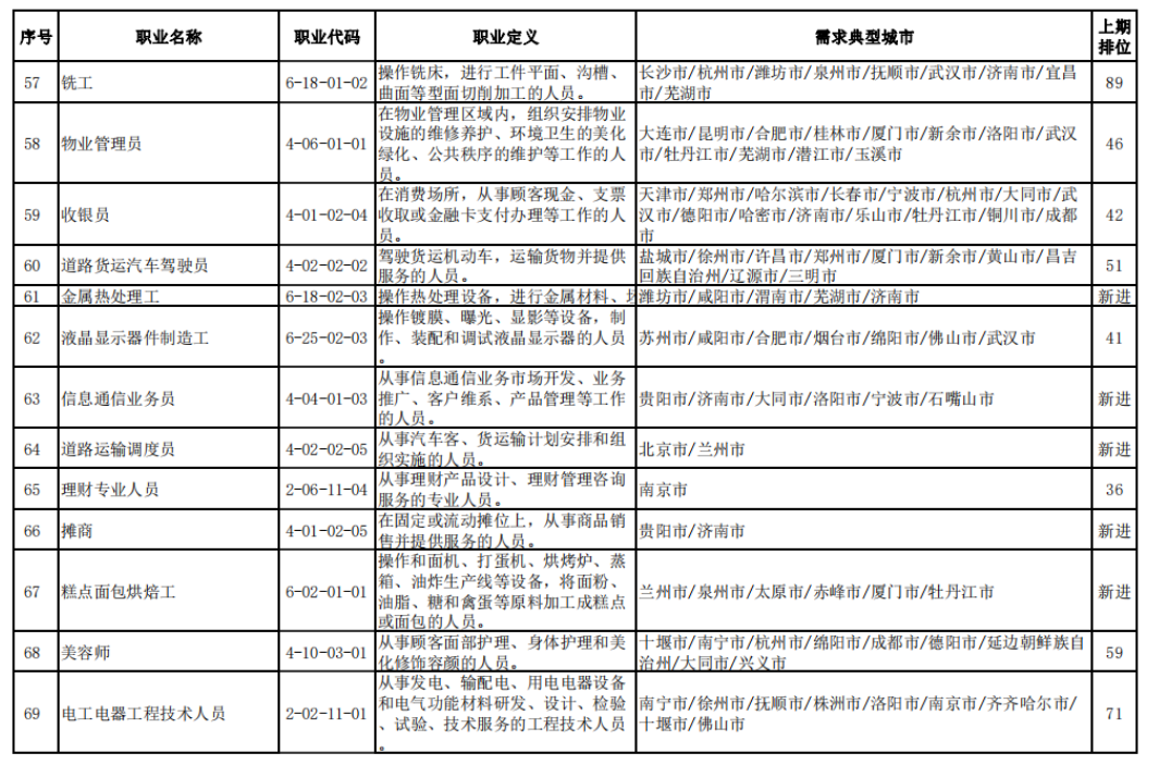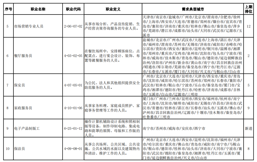 前十位职业分别为营销员、快递员、车工、商品营业员、市场营销专业人员、餐厅服务员、保安员、家政服务员、电子产品制版工、保洁员。 0 A% _! p9 j7 W2 k' ~9 c