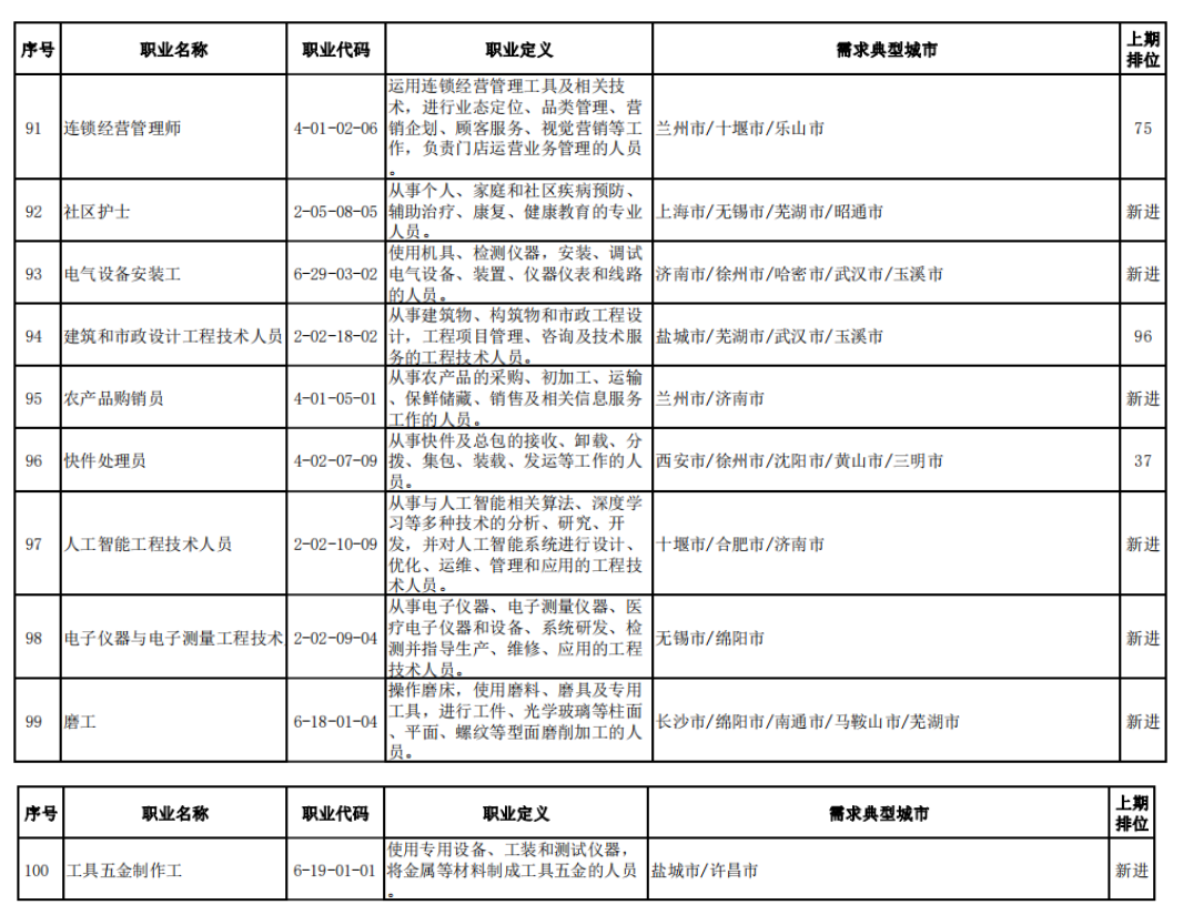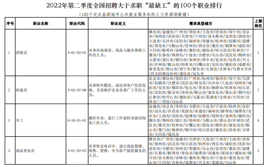 ) q2 A: m! ^0 j* I' R+ w! B9 n 中国就业培训技术指导中心近期组织102个定点监测城市公共就业服务机构,收集汇总2022年第二季度人力资源市场供求关系较为紧张的招聘、求职需求职业岗位信息,形成“2022年第二季度全国招聘大于求职‘最缺工’的100个职业排行”,现向社会公布。 4 b5 J; C! f5 @; K: M
