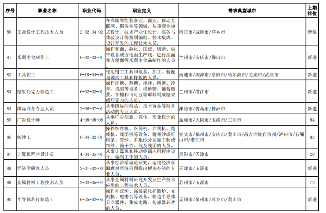 与2022年第一季度相比,招聘需求和求职人数持续回升,制造业缺工状况持续,电子信息产业缺工情况较为突出,“集成电路工程技术人员”“半导体芯片制造工”“电子仪器与电子测量工程技术人员”等职业新进排行,“半导体分立器件和集成电路装调工”“计算机网络工程技术人员”缺工程度加大,“电子产品制版工”进入排行“前十”,位列第9。 $ `3 p' O) g2 S, x! C7 j