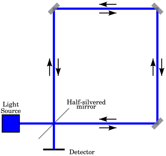 0 [: [* }+ t; ~: x. x 这就是萨尼亚克效应干涉仪,将一个光源发出的一束光分解为两束,让它们在同一个环路内沿相反方向循行一周后会合,然后在屏幕上产生干涉。