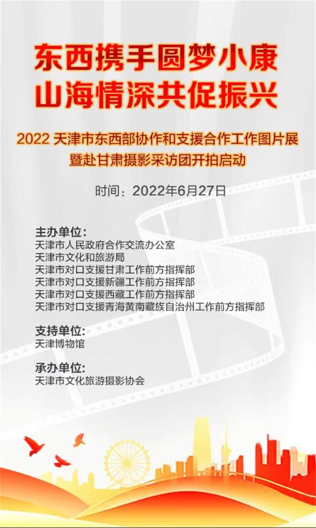 : I( p: v2 D4 S% ]% v 2022年6月27日上午,在天津市人民政府合作交流办公室举办了“东西携手圆梦小康 山海情深共促振兴---2022天津市东西部协作和支援合作工作图片展暨赴甘肃摄影采访团开拍启动仪式”活动。此次活动由天津市人民政府合作交流办公室、天津市文化和旅游局、天津市对口支援甘肃工作前方指挥部、天津市对口支援新疆工作前方指挥部、天津市对口支援西藏工作前方指挥部、天津市对口支援青海黄南藏族自治州工作前方指挥部主办,天津博物馆支持,天津市文化旅游摄影协会承办。