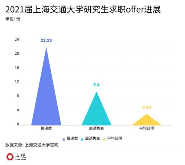 $ v( z* _3 ]/ m( W 根据上海交通大学的毕业生就业质量报告显示,本届研究生平均约投递22.3份简历,获得面试机会的平均有9.6个,而最终平均收获3.25个Offer,总过程平均历时3.09个月。可以看出即便是研究生,求职过程依然艰辛,平均投递七份简历才能收获一份Offer。 , j6 V# B3 Q8 c( Z: S" G