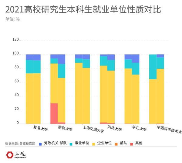 ; T8 Z4 @+ j8 _" W4 U0 _: V 此外除了中国科学技术大学,研究生去事业单位比例也比本科要高,南京大学本科生和研究生选择进入事业单位的差值达12.8%。与此相对应的选择企业就业的研究生比例则相对减小。这意味着考取研究生更多程度上也是为了进入党政机关或者事业单位等体制内,研究生也更青睐这类稳重的工作。
