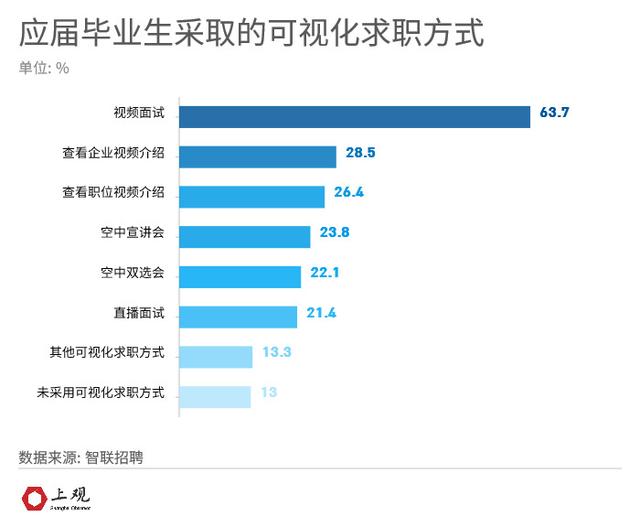 ) A8 \* o( Z& N0 W1 g 在智联招聘对今年毕业生一季度就业情况的调研当中,有87%的受访者表示通过可视化的方式求职,其中采用视频面试的占比63.7%,还有30%则通过查看企业和职位的视频介绍进行选择。