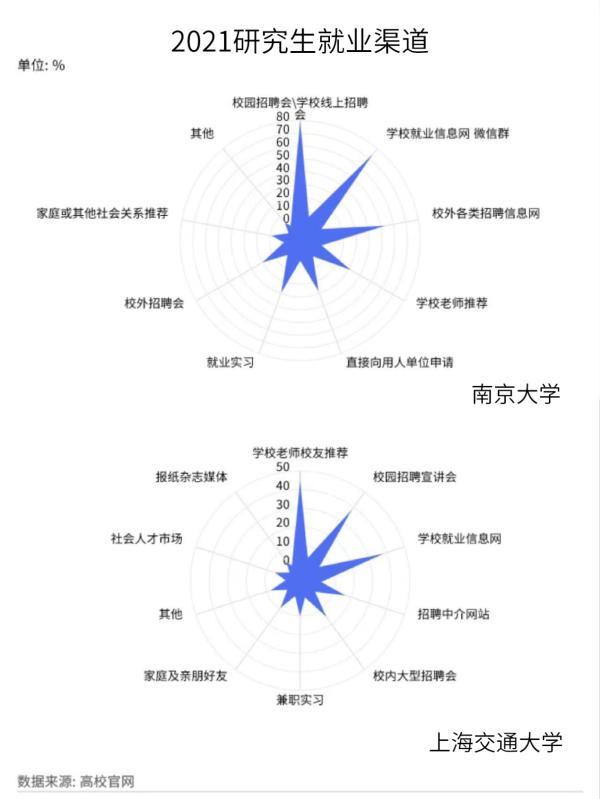 以南京大学和上海交通大学为例,在南京大学,校园招聘会仍然是研究生的就业主渠道,其次是学校官方就业信息网以及校外中介类招聘信息渠道和学校老师推荐。而在上海交通大学,学校老师推荐渠道排名第一。
