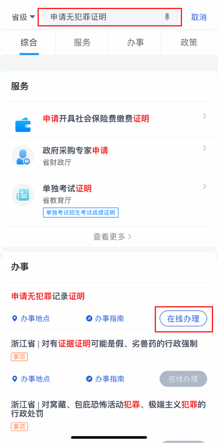 2 j5 }$ K' _6 r) F0 ~. C6 H" } 一、“浙里办”搜索进入“申请无犯罪记录证明”,点击在线办理。