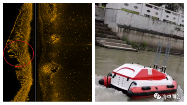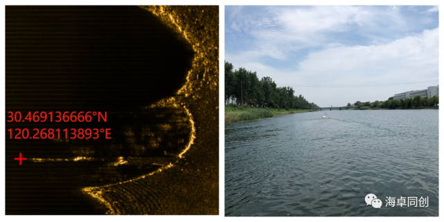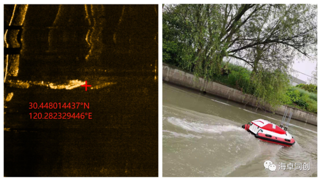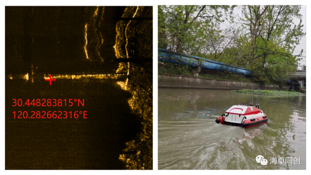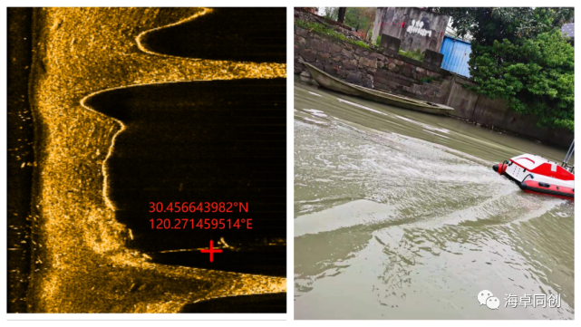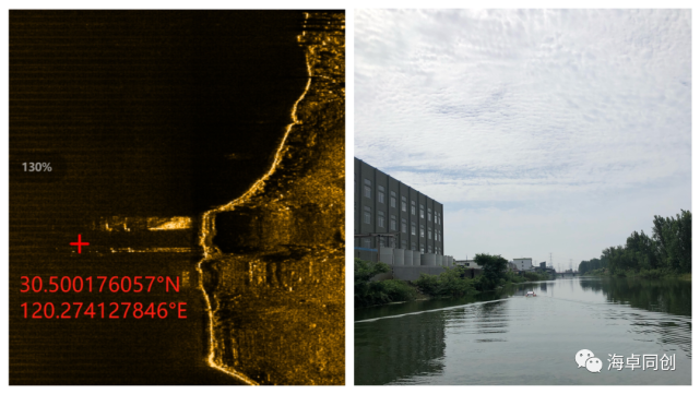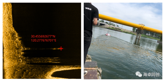/ @% f% b, k( ~ \" m9 X 根据现场环境和需求,无人船+侧扫声呐来进行暗管排查和定位为最优扫测方案。环保部门组织也最终决定采用小型无人船搭载海卓ES90系列声呐水下暗管排查仪进行扫测实施。 - H! D% B p, T5 B7 E3 b4 } G