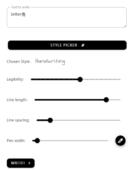 ; M9 Y0 Z5 r$ W% \ 在右边可以输入想要生成的文本,但目前还不支持中文,有各种各样的参数可以调节,并且每次点击Write后生成的手写体都不一样。 ' ~: T) Q* w K