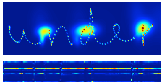 手写预测的混合密度输出。顶部的热图显示了「under」这个词写的时候,预测的笔位置的概率分布序列。连续预测的密度被加在一起,给出了分布重叠的高值。