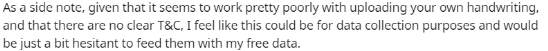 鉴于上传自己的笔迹看起来效果很差,而且没有明确的笔迹标注,我觉得这可能是为了数据收集的目的,并且在用我的免费数据提供给他们时可能会有点犹豫。