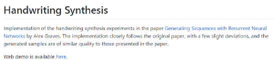 8 ~5 u9 J3 `5 g 他所说的是github的一个著名仓库,手写体合成,目前已获得超1400颗星。