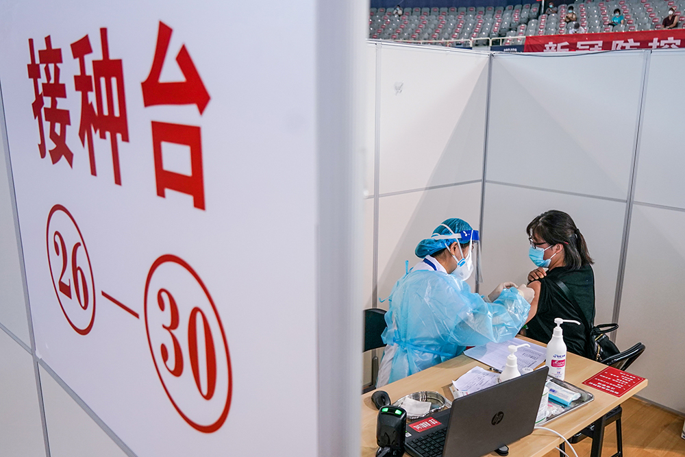 2021年8月2日,市民在南京市鼓楼区五台山体育中心新冠病毒疫苗集中接种点接种疫苗。新华社 图