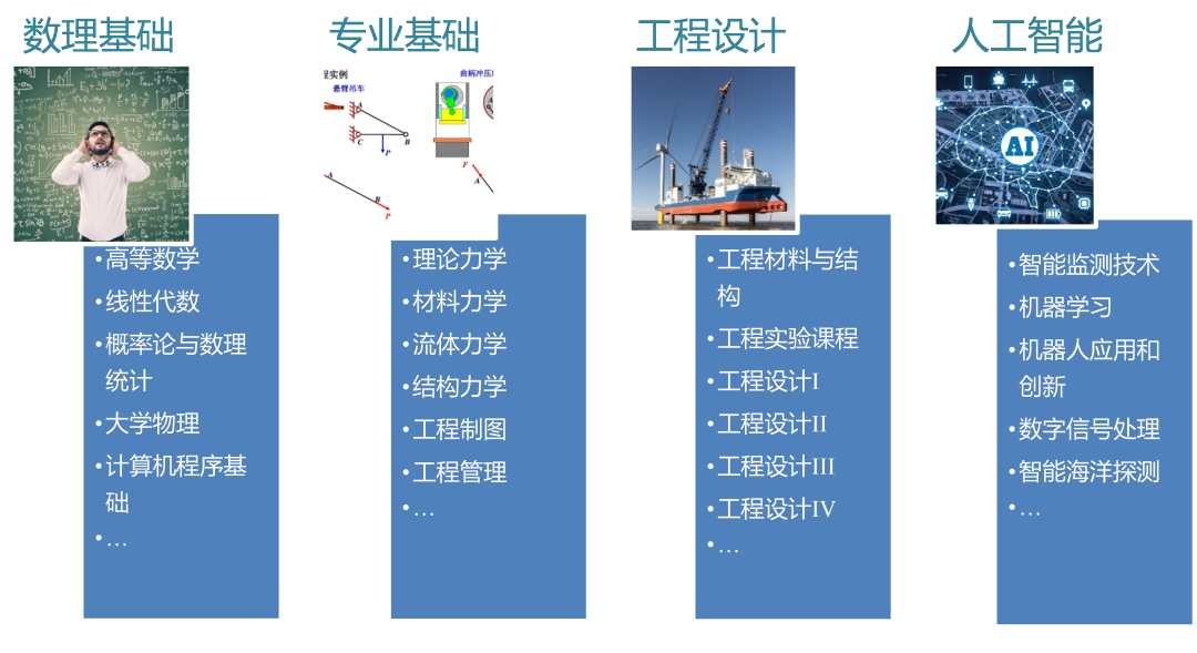 ( H0 K5 ~' r+ n5 [' a 海洋工程与技术专业以工程应用为指导,数理基础和专业基础为支点,结合新兴的人工智能手段,应用于工程设计中。以培养同学们的动手能力、思考能力、分析能力和解决工程需求专业能力。