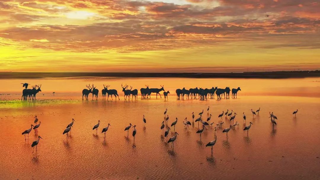 $ G$ H2 D- _! s& A 目前,大丰麋鹿种群扩大到6000多头,有1000多头被放归自然,黄海滩涂湿地再现神鹿奔跑的身影。