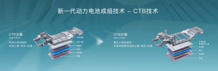 CTB技术相比上一代CTP方案最大的不同点在于将电池上盖与车身地板进一步融合,从而实现电池系统体积利用率、能量密度的进一步提升。同时通过高刚性电池与车身深度融合,车身系统扭转刚度、弯曲刚度、安全性、轻量化水平均大幅提升。