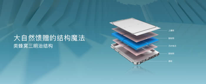 刀片电池成组灵感源于高强度的蜂窝铝板,通过结构胶将上下铝板与蜂窝铝芯粘连之后,形成具有高强度的蜂窝铝板,刀片电池基于这一原理构造了独特的类蜂窝成组机构,在电芯安全之外,让动力电池系统同样具备了类似蜂窝铝板的高强度表现。 : o1 @4 Y, p$ ^+ U" ]