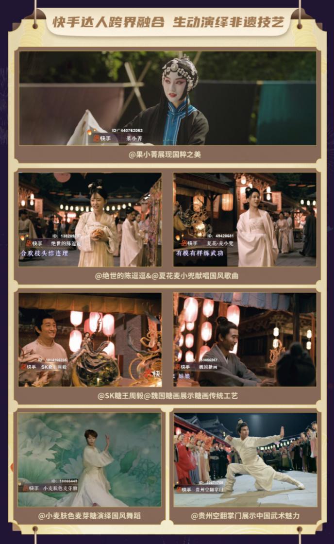 @魏国糖画、@SK糖王周毅 立于街头,展现了糖画和翻糖等传统技艺,@贵州空翻掌门 拿出了“飞檐走壁”的轻功绝技,@果小菁 带来了经典京剧曲目《武家坡》,还有@绝世的陈逗逗、@夏花·麦小兜、@小麦肤色麦芽糖 等达人一展歌舞才艺。由此可见,快手上传统文化相关的内容生态不断发展完善,为本次晚会提供了文化传承内容的有力支撑。