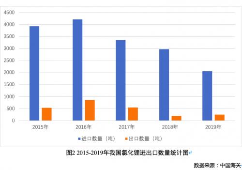 无水氯化锂的主要应用领域是做熔盐电解生产金属锂的原料。2019年我国氯化锂产量大于3.6万吨,全年进口量2053吨,同比下降30.8%;出口量253吨,同比增长23.8%。虽然我国氯化锂的进口量呈逐年下降的趋势,但规模远远大于出口量。目前,国内赣锋锂业、天齐锂业、天铁股份、青海中科捷鑫等企业拥有氯化锂的生产线,但远不能满足未来发展需要,扩大国内氯化锂生产能力十分必要。预计,我国氯化锂需求量未来五年的复合增长率会维持在10%以上,预计2025年需求量会达到7万吨。 1 F: g t+ {% u