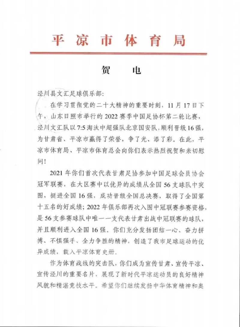 赢得比赛后平凉市体育局、平凉市体育总会向泾川县文汇足球俱乐部发来的贺电。 图片由受访者提供