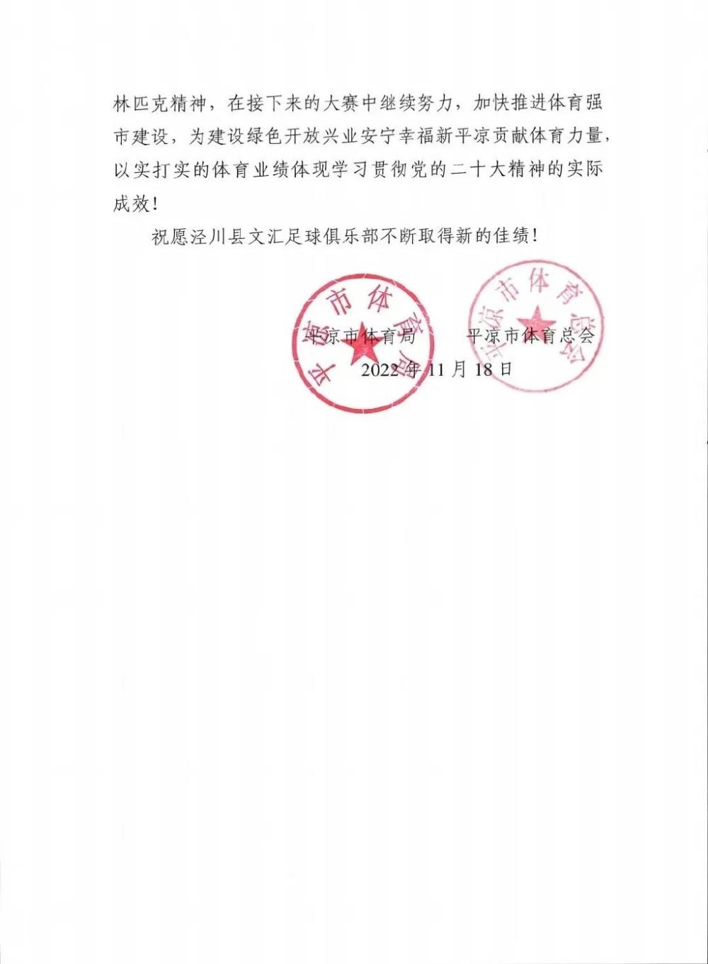 8 F& c8 H' j0 l" W 据《平凉日报》报道:2013年,泾川县30多名足球爱好者组建了足球俱乐部。2021年注册成立了泾川县文汇足球俱乐部。同年,泾川文汇首次代表甘肃足协参加中国足球会员协会冠军联赛,晋级全国总决赛。2022年俱乐部再次入围中冠联赛参赛资格,是56支参赛球队中唯一一支代表甘肃出战中冠联赛的球队,并再次进入全国16强。